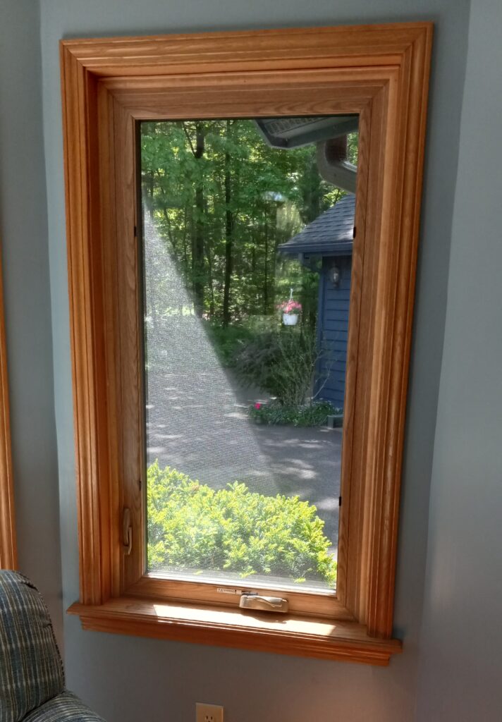 We just installed these windows near Traverse City. Are they wood windows or are they vinyl? Look closely. This is a vinyl window with the faux wood look. It’s hard to tell unless you get extremely close. It’s amazing what our factories can do nowadays. I have colonial cherry windows in my house and they go great with all the other wood in my house and I have a lot of it. (I would love to know how they make the wood grain.)